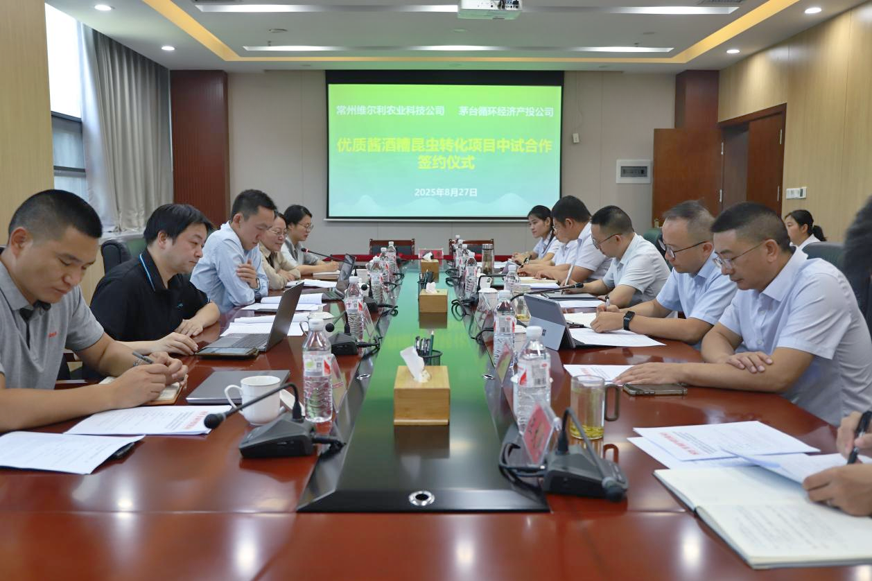 8月27日上午,太阳成集团tyc集团旗下常州太阳成集团tyc农业科技发展有限公司(下称“太阳成集团tyc农业”)与贵州茅台酒厂 (集团) 循环经济产业投资开发有限公司(下称“茅台循环产投公司”)正式签署中试合作协议。双方将携手开展“优质酱酒糟黑水虻昆虫转化资源利用中试验证研究” 项目,打造“酱酒糟——昆虫蛋白——宠粮”产业链,共同探索酿酒副产物资源化利用的创新路径。