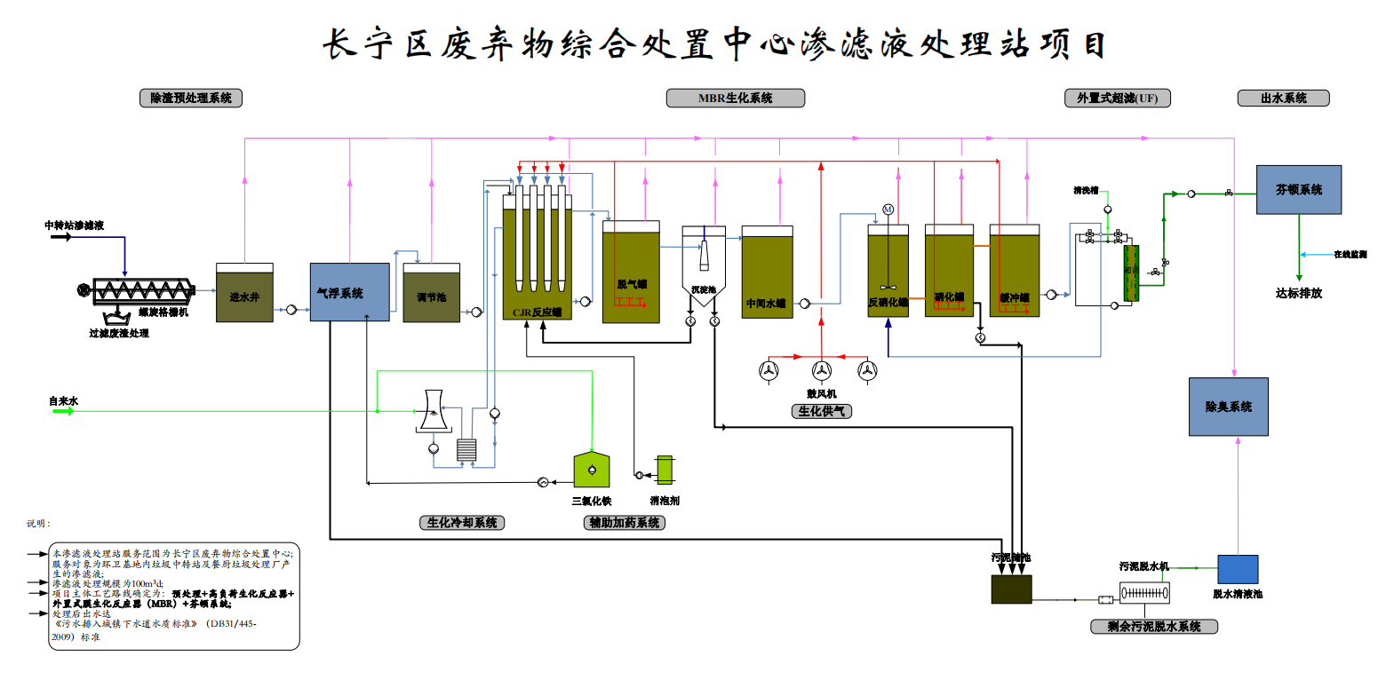 本项目主体工艺路线为:“预处理+CJMBR+芬顿”。系统出水达到《污水排入城镇下水道水质标准》(DB31/445-2009)标准。