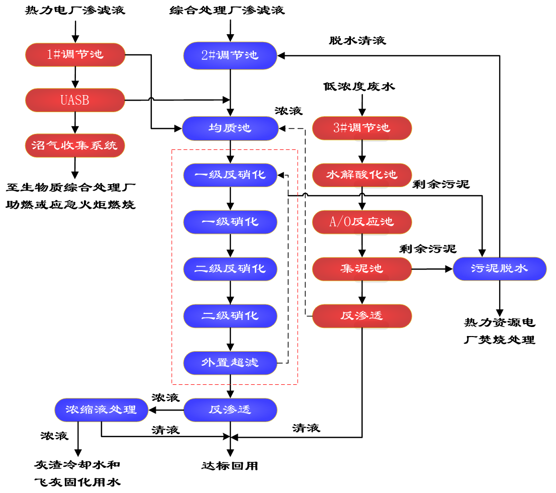 本项目分为高浓度废水处理系统与低浓度废水处理系统。高浓度废水采用“预沉调节池+厌氧+MBR+反渗透”组合处理工艺;低浓度废水采用“水解酸化+接触氧化+机械过滤+RO”组合处理工艺。