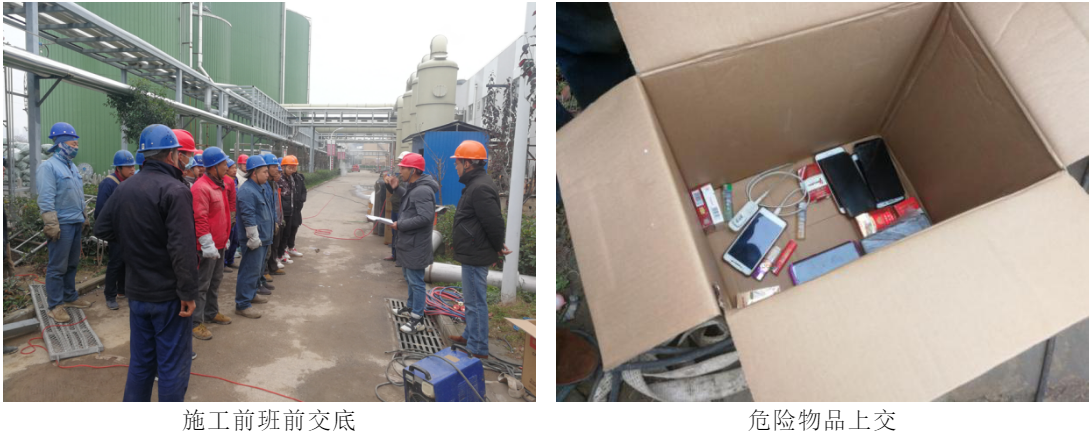 由于管道对接存在动火作业,一期厌氧罐、脱硫区域内管道及设备内部几乎均有沼气,危险性较大。正式施工前,召开班前会议,进行方案交底工作,做到“三交一清”(施工任务交底、施工环境交底、安全注意事项交底,清楚员工思想及身体动态)。