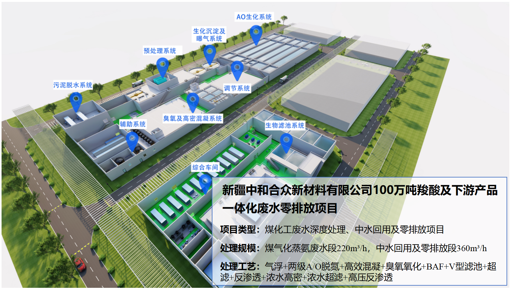 近日,太阳成集团tyc集团成功签署了新疆中和合众新材料有限公司100万吨羧酸及下游产品一体化废水零排放项目。该项目涉及煤气化蒸氨废水处理和中水回用及零排放处理。煤气化蒸氨废水段的设计处理能力为220m³/h,中水回用及零排放段的设计处理能力为360m³/h。产水水质满足《城市污水再生利用-工业用水水质》(GB/T 19923-2005)中锅炉补给水水质标准。